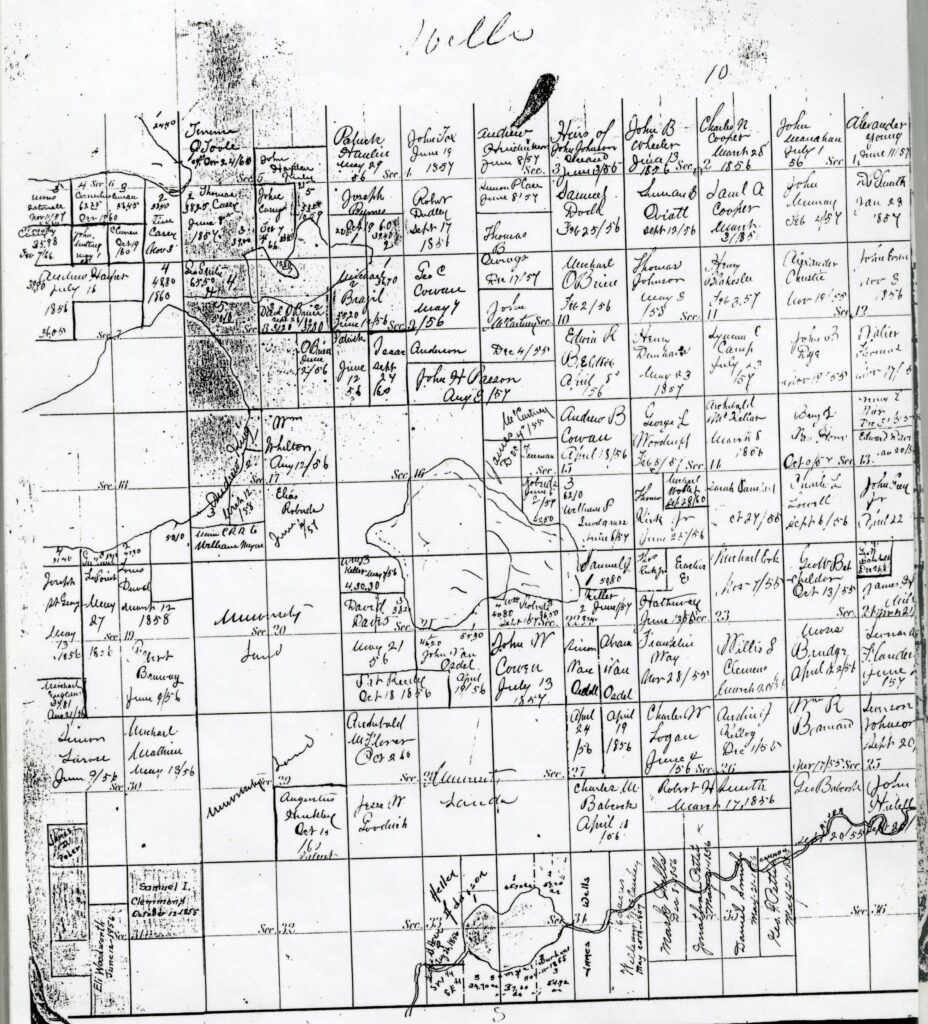 Bully had staked a claim in section 34 of Wells Township as soon as the property came on the market in 1853. The area he claimed was prairie land in southeastern Wells Township, which was much easier to establish farmland on than forested land. He soon turned from trading to farming. By 1858, he is reported as having “one of the finest (farms) in the vicinity” of Faribault.