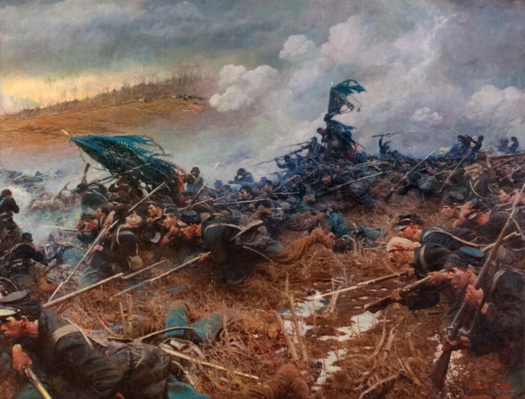 In the Governor’s Reception Room of the Minnesota State Capitol, Howard Pyle’s sweeping mural The Battle of Nashville commands attention. Installed in 1906, it depicts Minnesota regiments charging across muddy cornfields toward Shy’s Hill on December 16, 1864. That day, 87 Minnesotans fell—the state’s bloodiest single day of the Civil War. Behind those brushstrokes lies the story of one man whose life and death embodied that sacrifice: Maj. Michael Cook.